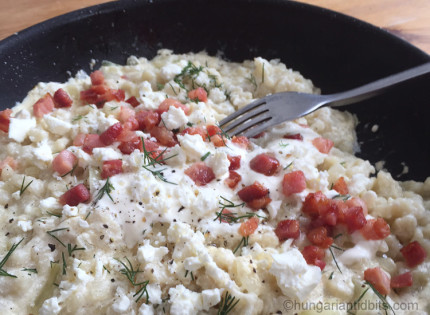 I even surprised myself how well these dumplings turned out. They are warmingly filling, a savory-sweet dish that is a hot favourite in many if not all Hungarian kitchens. It’s often offered in restaurants on their dessert list but also makes a decent second course and a smashing afters for Hungarian goulash soup. And here is the recipe, this will make 4-6 dumplings depending on size and enough for two people:
